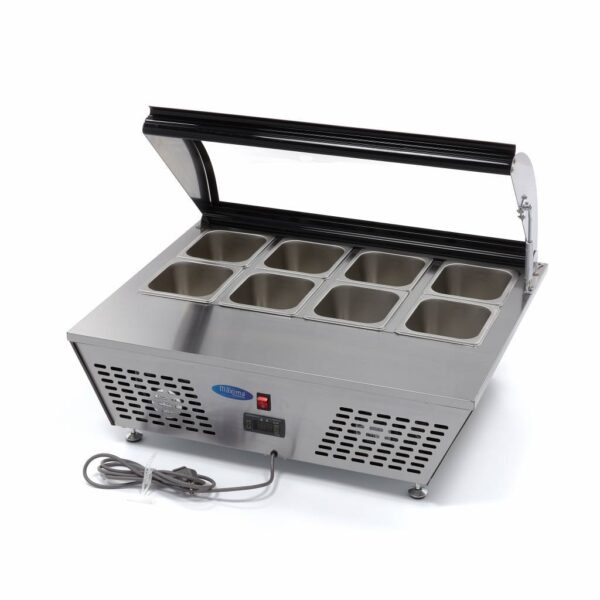 Krásny mini šalát s luxusnou povrchovou úpravou, stolný model. Nerezová konštrukcia s nerezovou pracovnou doskou a skleneným krytom. Kapacita: 8 x 1/6 GN alebo 4 x 1/3 GN.