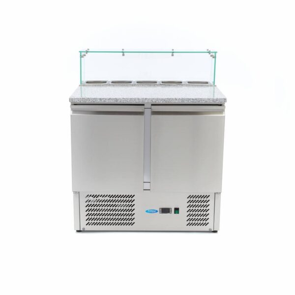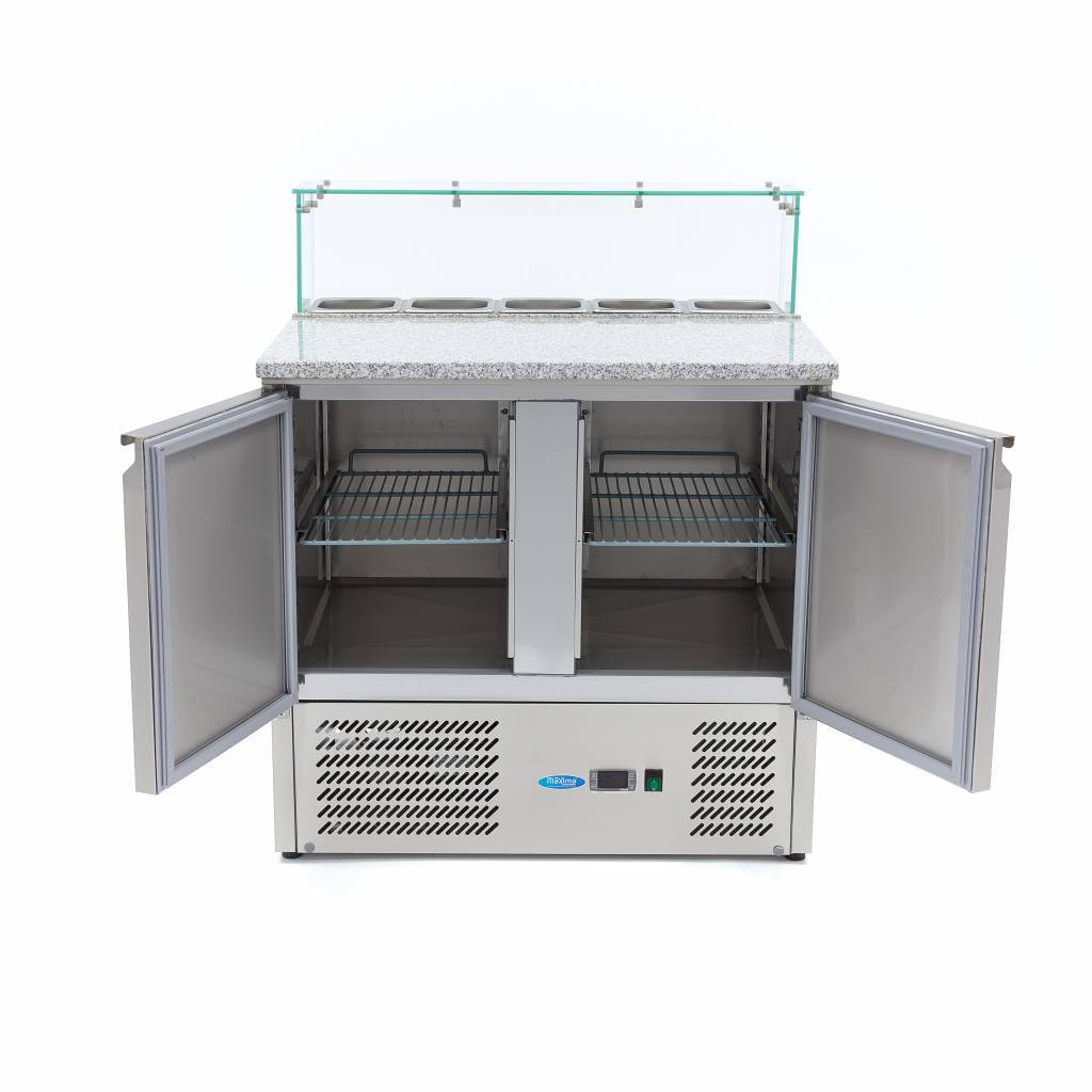Pekný stôl na pizzu s luxusnou nerezovou konštrukciou so žulovou pracovnou doskou. Kapacita pre 5 x 1/6 GN. Vybavený sklenenou doskou.