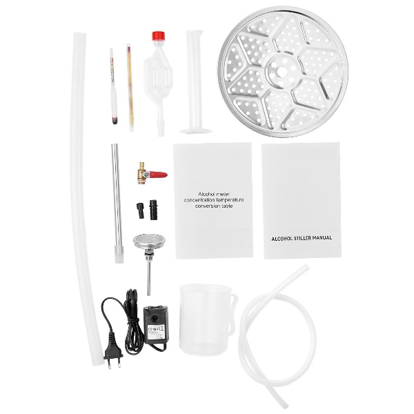 30L destilátor – Destilátor sa skladá z kotla s objemom 30L. Skondenzovaná zmes vo forme pary stúpa hore do chladiča, kde pomocou systému chladiacich trubíc kondenzuje späť na kvapalnú látku a vyteká von z destilátora do pripravenej nádoby.