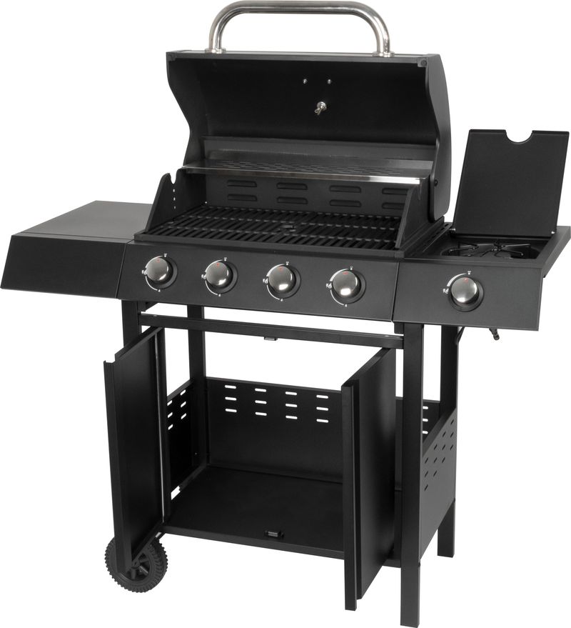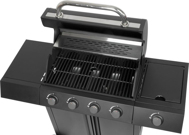 Plynový 4+1 horákový gril je ideálny na rýchlu prípravu jedál. Súčasťou je tiež jeden samostatný horák na pravej strane, pre potrebu jednoduchého varenia vonku. Na ľavej strane sa nachádza menší odkladací priestor, kde si môžeme uložiť grilovacie kliešte a pod. Hlavná grilovacia časť sa nachádza pod vrchným kovovým krytom. Varná mriežka je vyrobená zo smaltovanej ocele. Výhodou grilu je zabudovaný ukazovateľ teploty z nehrdzavejúcej ocele, vďaka čomu nemusíte jedlo neustále kontrolovať. Pod grilovacou časťou sa tiež nachádza odkladací priestor, ktorý môžete využiť na umiestnene plynovej fľaše. Pre funkčnosť grilu sa používa štandardná plynová fľaša s hmotnosťou náplne do 11 kg. Celý povrch je pokrytý krásnou práškovou čiernou farbou. Z hľadiska čistenia na tomto grile oceníte, že sa mastnota po grilovaní odstraňuje veľmi jednoducho. Rozmery grilu sú 120 x 53 x 110 cm. Hmotnosť je 28,5 kg, teda nie je ideálny na každodenné prenášanie. V prípade potreba je však podstava vybavená dvomi kolieskami, ktoré vám nutný prenos uľahčia.