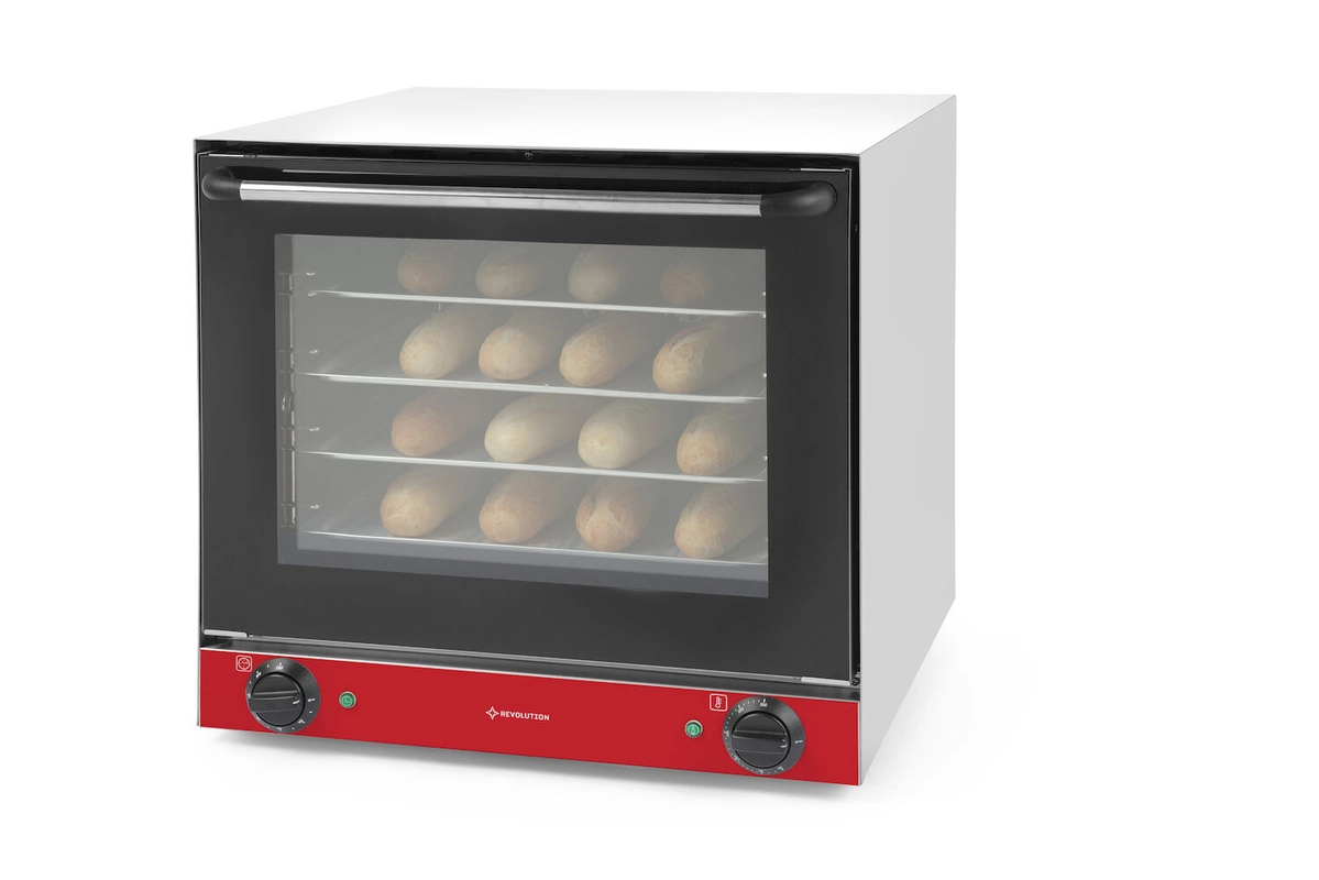 - Komora na pečenie na 4 plechy 436 x 315 mm Elektromechanické ovládanie Plynulá regulácia teploty v rozmedzí 50 ˚C až 300 ˚C. Ochrana proti prehriatiu s ručným resetom Časovač od 0 do 120 minút so zvukovým signálom Kontrolky prevádzky vykurovacích telies a pripojenia k sieti Dvojité okrúhle vykurovacie telesá s dvomi vysokorýchlostnými ventilátormi Ventilátory pre optimálnu distribúciu tepla v komore Dvojité zosilnené sklo pre lepšiu viditeľnosť, chladné na dotyk vďaka gravitačnému chladeniu