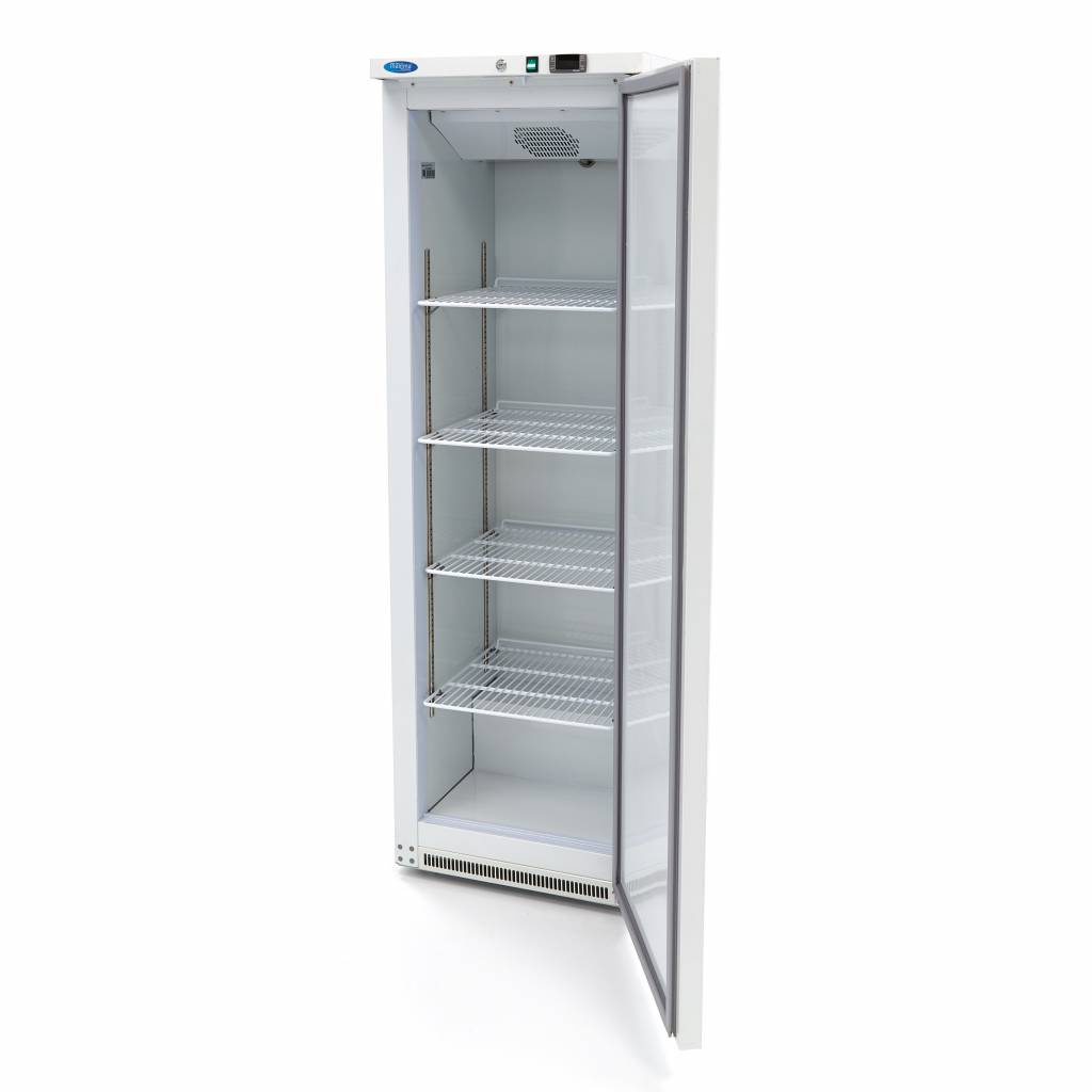 Stredná, profesionálna mraznička s objemom 400 litrov, s bielym kovovým povrchom, zámkom a 4 pevnými policami. Digitálna regulácia teploty.