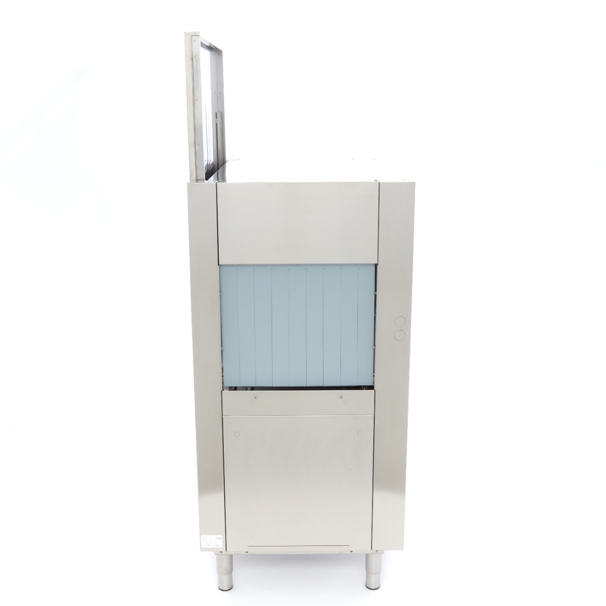 Tento regálový umývač riadu je ideálny na čistenie veľkého množstva riadu, najmä počas rušných časov dňa. Regály s špinavým riadom sa rýchlo a ľahko posúvajú cez stroj na regálové dopravovanie pre kompletné umytie, ktoré ich zanechá čisté a pripravené na použitie znova. Tento komerčný umývač riadu má kapacitu na umytie medzi 60 a 120 regálov za hodinu. Môže byť rozšírený o nerezový stôl s valcami na ľavej strane umývača.