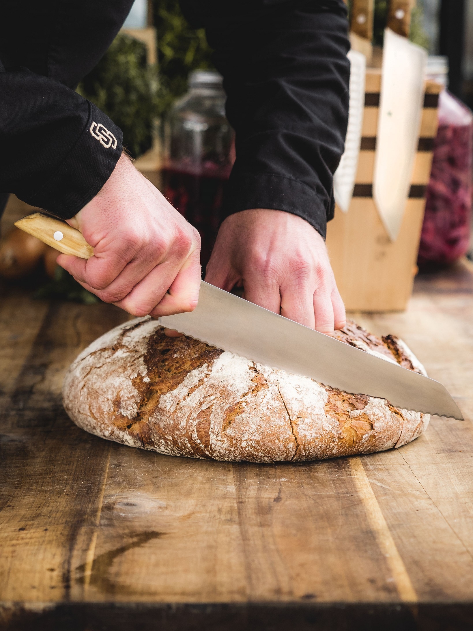 - Ľahko nakrája tvrdú kôrku a vďaka vlnitému výbrusu na čepeli pečivo nepokrčí.