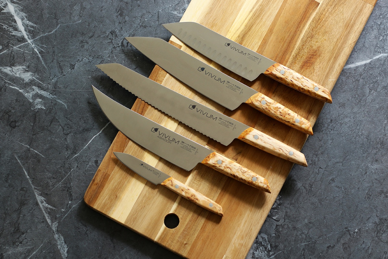 Nová rada nožov – VIVUM. Tieto jedinečné nože kombinujú prirodzený vzhľad s extrémnou ostrosťou: elegantná a špeciálne tvarovaná rukoväť z brezového dreva sa spája s najkvalitnejšou oceľou noža a moderným dizajnom čepele. Vďaka veľmi zvláštnej kresbe dreva je každá rukoväť VIVUM jedinečná. Tvar rukoväte nielen pôsobivo vyzerá, ale aj príjemne padne do ruky. Pre rad VIVUM je použitá špeciálna vysoko legovaná oceľ ponúkajúca vynikajúci rezný výkon, výnimočnú tvrdosť a odolnosť proti korózii.