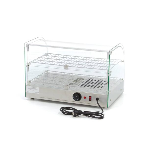 Výkonný ohrievač tohto profesionálneho spotrebiča zaisťuje efektívne rozdeľovanie tepla. Zabezpečuje, že všetky produkty zostanú konzistentne pri správnej teplote. Aby sa zabránilo vysušeniu jedla, vyhrievaný stojan na jedlo obsahuje aj nádržku na zvlhčovanie vzduchu. Je tu používateľsky prívetivý teplotný ovládač, ktorý vám umožní nastaviť termostat v rozsahu od 30 do 90 °C. Stojan na jedlo je tiež vybavený indikačnou kontrolkou, ktorá ukazuje, kedy bola dosiahnutá zvolená teplota.