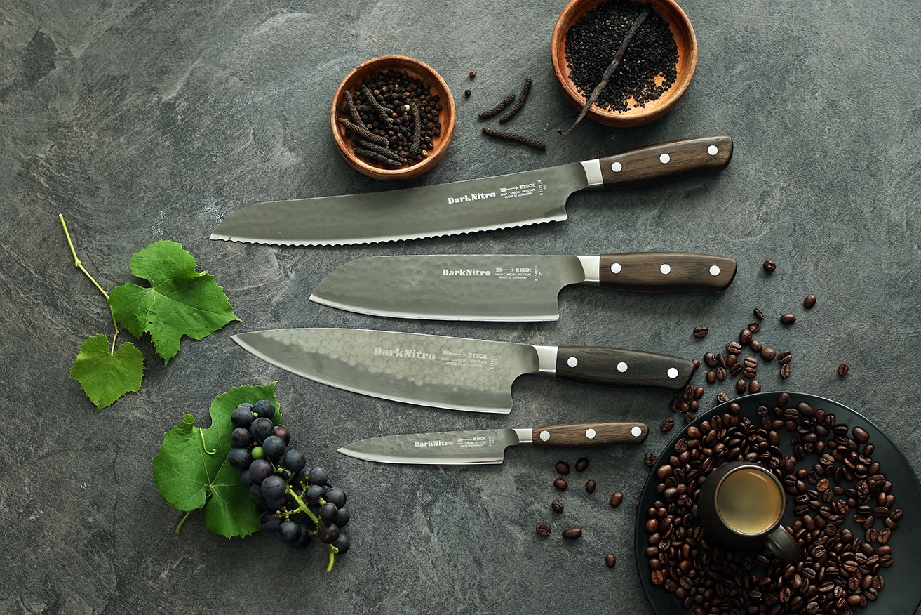 Nože sú vytvorené spojením jedinečnej čepele s tepaným povrchom a karbónovým vzhľadom a taktiež rukoväťou z cenného nezničiteľného dubového dreva. Funkčné, vyvážený, extrémne tvrdý. Tenká čepeľ, skosená záštita a ergonomická rukoväť robia z nožov z radu DarkNitro prvotriedny nôž. Antracitová čepeľ je farbená pomocou špeciálneho procesu šetrného k životnému prostrediu. To dáva nožom ich čistú industriálnu krásu. Tepaná úprava čepele podčiarkuje jej jedinečnosť a funkčnosť. Dubová rukoväť symbolizuje vytrvalosť, moc a silu. Ostrá a jasná línia rukoväte posilňuje estetiku noža.