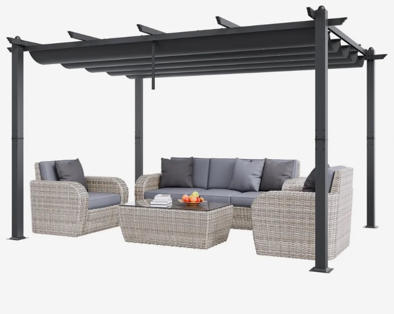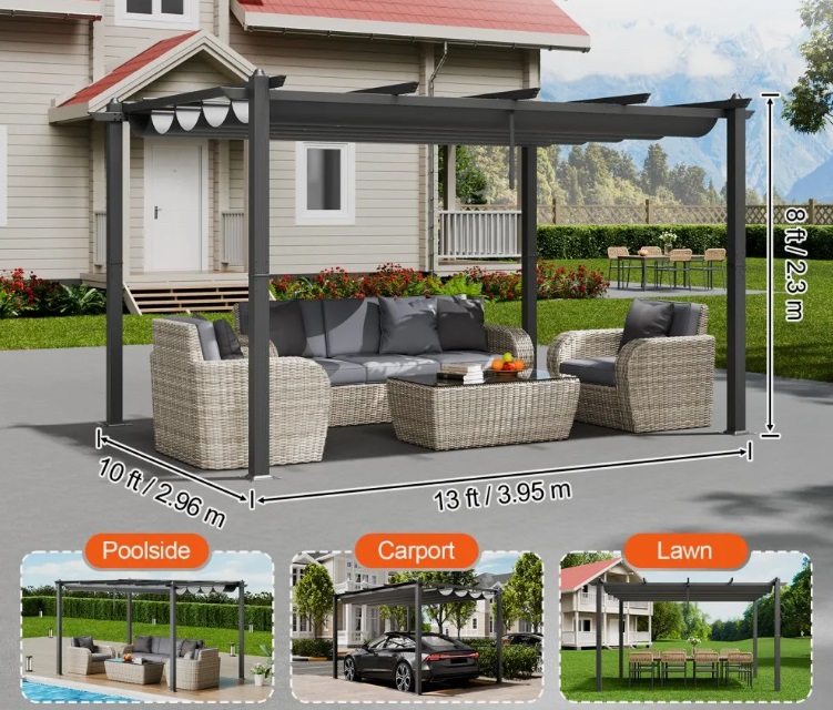 - Nastaviteľná tieniaca strieška: Vďaka nastaviteľnej, zasúvacej strieške a integrovanej posuvnej koľajnici si môžete jednoducho nastaviť plochu tieňa podľa potreby. Či už potrebujete tieň v horúcich dňoch alebo úkryt pred slabým dažďom, táto pergola ponúka najlepší komfort a umožňuje vám vychutnať si dokonalú rovnováhu medzi slnkom a tieňom.