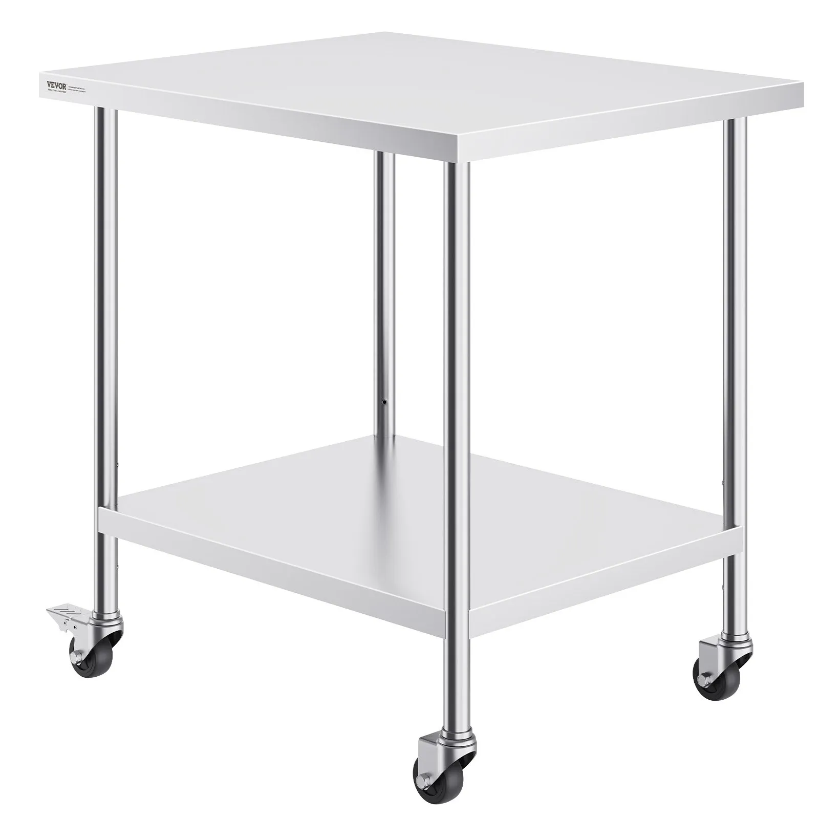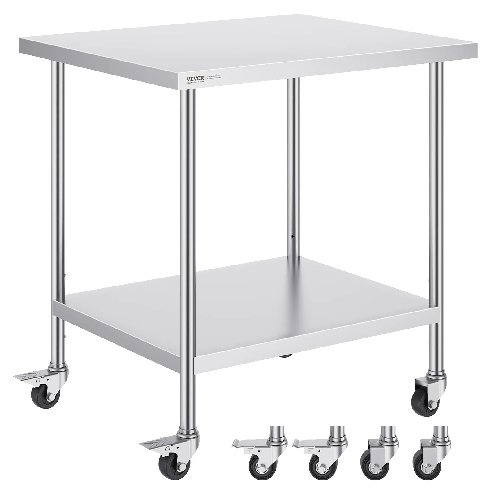 × Pracovný stôl z nehrdzavejúcej ocele, prípravný stôl so 4 kolieskami, 3 nastaviteľné výšky, pracovný stôl na prípravu jedál pre komerčné kuchyne a reštaurácie, strieborný