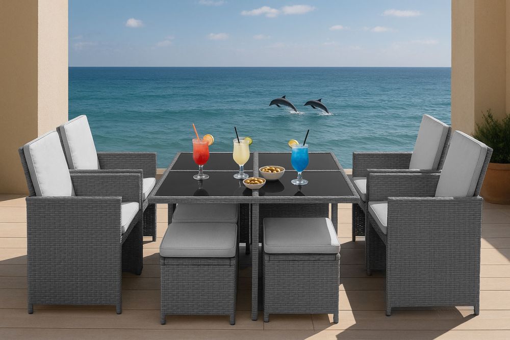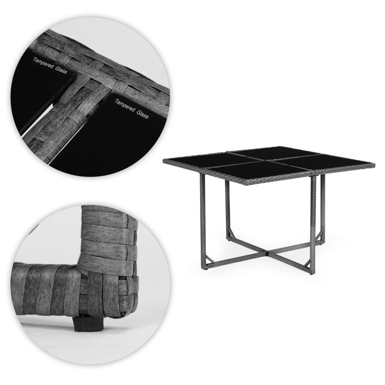 Táto štýlová záhradná súprava nábytku pozostáva zo štyroch kresiel, štyroch taburetiek a stola. Konštrukcia je založená na oceľovom ráme potiahnutom technoratanom , ktorý zaisťuje trvácnosť, odolnosť voči poveternostným vplyvom a jednoduché čistenie. Nohy sú vybavené protišmykovými nožičkami pre väčšiu stabilitu. Súčasťou súpravy sú taburetky, ktoré môžu slúžiť ako pohodlné opierky na nohy alebo ako ďalšie sedadlá. Pevný stôl má dosku z tvrdeného skla , ktorá je odolná voči mechanickému poškodeniu. Mäkké sedáky sú vyrobené z nepremokavého polyesteru s gramážou 160 g/m² , čo zaisťuje pohodlie. Kreslá majú polohovateľné operadlá a taburetky sa dajú uložiť dovnútra, čo umožňuje zložiť celú súpravu do kompaktnej kocky . Maximálna nosnosť stoličky je 150 kg .