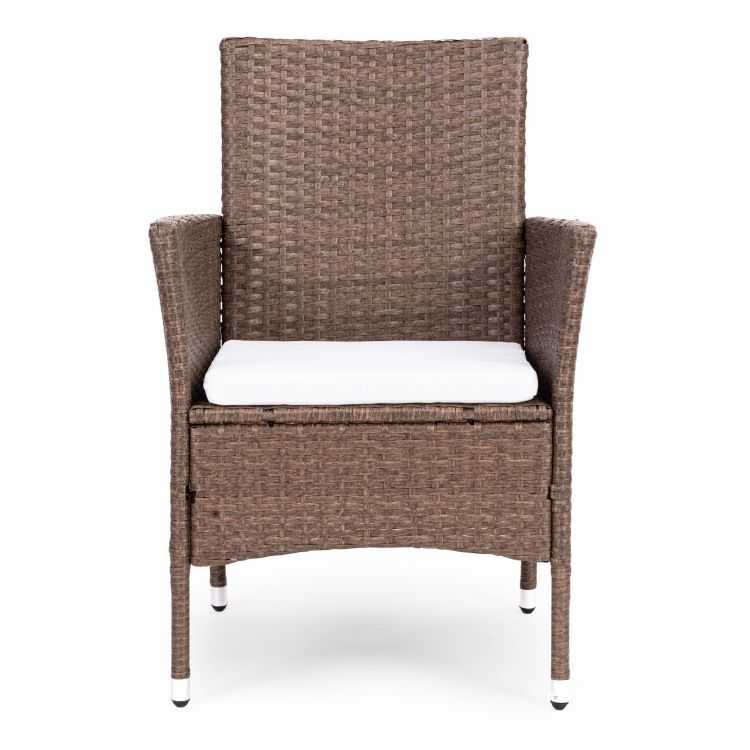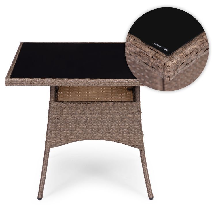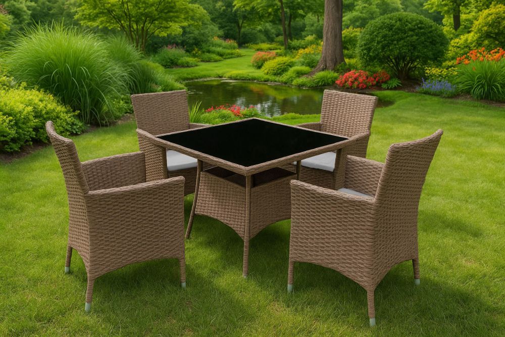 Táto štýlová záhradná súprava nábytku sa skladá zo štyroch stoličiek a stola . Konštrukcia je vyrobená z masívnej ocele potiahnutej technoratanom , čo zaručuje odolnosť voči poveternostným vplyvom, dlhú životnosť a jednoduché čistenie. Doska stola z tvrdeného skla zaručuje vysokú odolnosť voči poškodeniu. Mäkké sedáky sú vyrobené z vodeodolného polyesteru s gramážou 160 g/m² . Nohy sú vybavené protišmykovými klzákmi pre zvýšenú stabilitu. Maximálna nosnosť stoličiek je 150 kg .