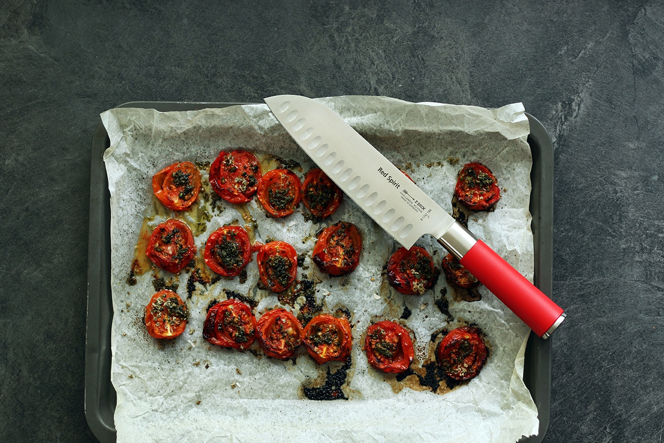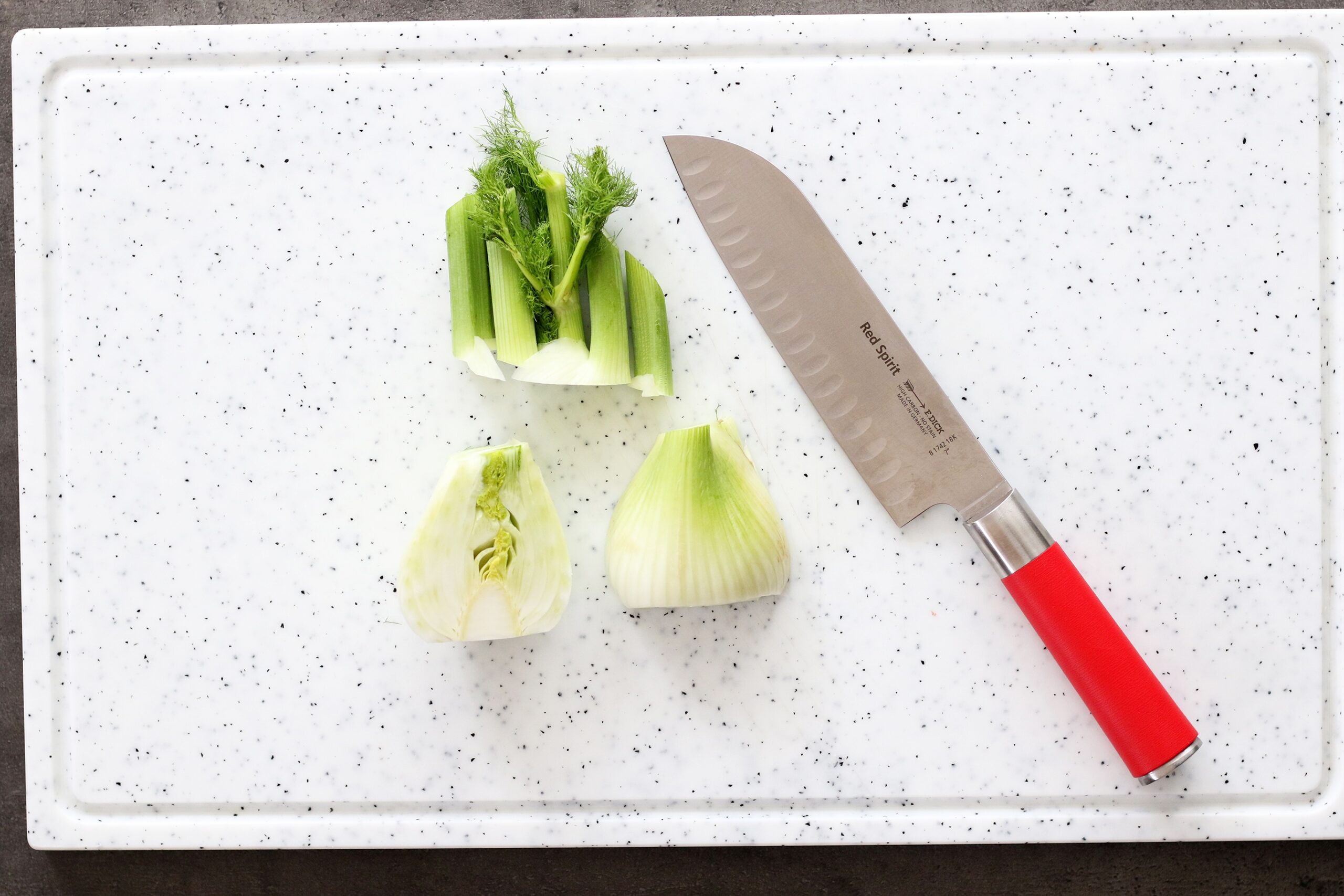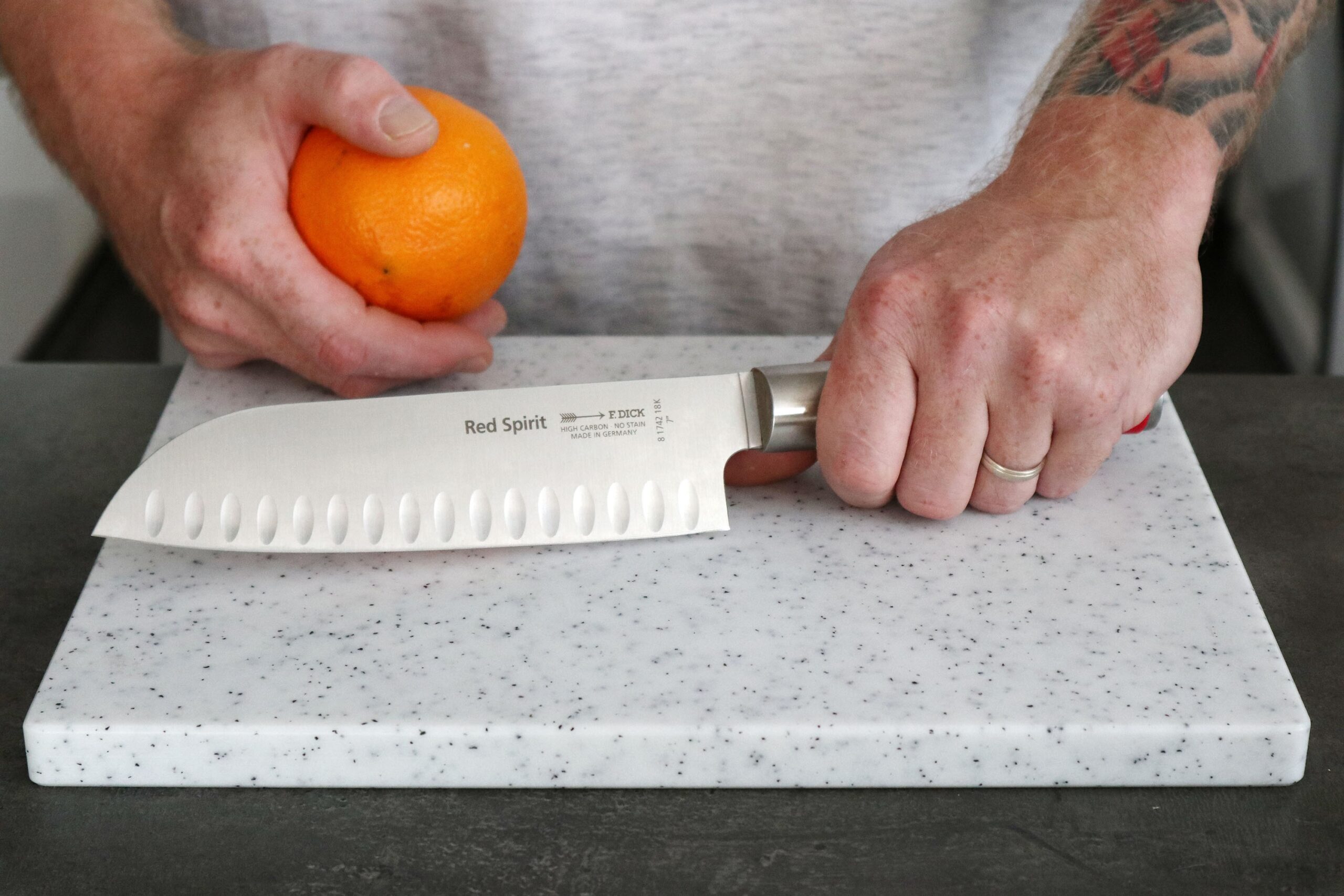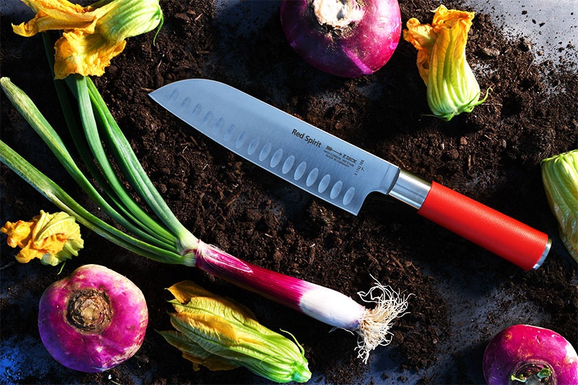 Santoku so špeciálnym výbrusom Dick zo série RED SPIRIT v dĺžke 18 cm. Používa sa na krájanie zeleniny , ovocia , mäsa i byliniek . V kuchyni je univerzálnym pomocníkom . Vďaka špeciálnemu výbrusu krájaný produkt nelepí na noži. Široká plocha noža umožňuje nakrájanú zeleninu rovno nabrať na čepeľ noža a vložiť do panvice alebo hrnca.