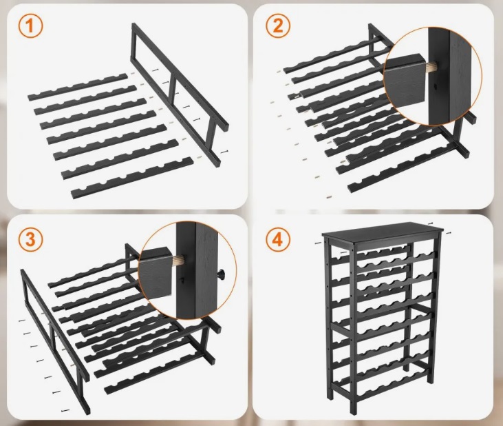 Jednoduchá montáž: Montáž nášho voľne stojaceho stojanu na víno je hračka. Jednoducho postupujte podľa pokynov na utiahnutie skrutiek a stojan môžete okamžite nastaviť. Ak potrebujete stojan premiestniť, najskôr vyberte fľaše.