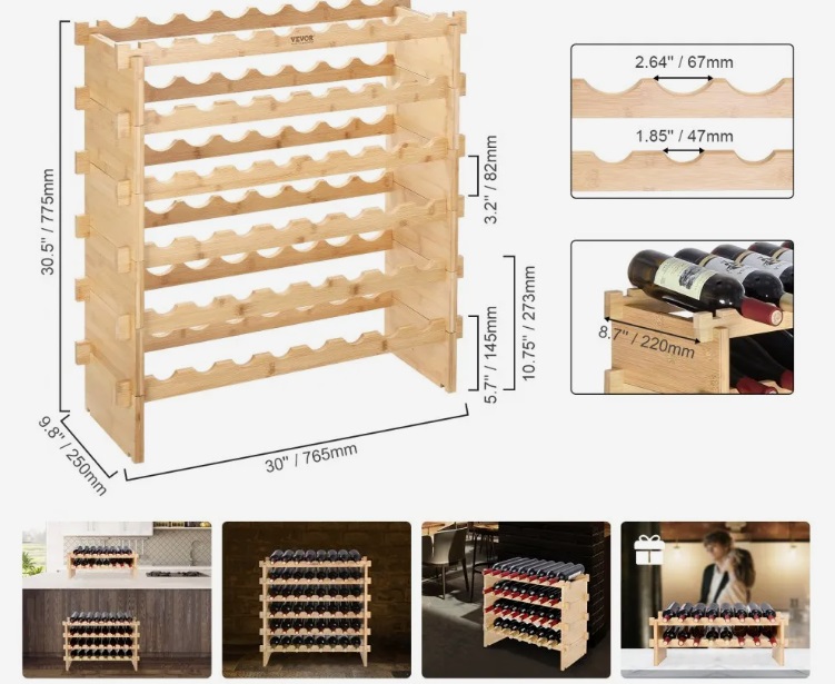 Stohovateľný stojan na víno až pre 48 fliaš: Tento stohovateľný modulárny stojan na víno má rozmery približne 30 x 9,8 x 30,5 palcov / 762 x 248,9 x 774,7 mm (Š x H x V) a pojme až 48 fliaš (6 priehradiek po 8 fľašiach). Je všestranný a hodí sa do každej miestnosti, či už je to kuchyňa, jedáleň alebo vínna pivnica. Je tiež ideálnym darčekom pre milovníkov vína a zberateľov. Upozorňujeme, že vína NIE SÚ SÚČASŤOU BALENIA.