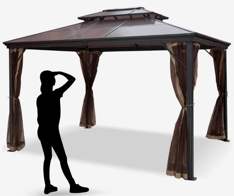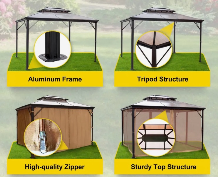 - Pevný a súkromný terasový altánok: Dvojúrovňová strecha s pevnými tyčami a plechmi predlžuje výšku prístrešku a zaisťuje dostatočné vetranie, odvodnenie a cirkuláciu vzduchu. Vrchná časť obsahuje háky na zavesenie terasového ohrievača alebo lampáša. Vysokokvalitné moskytiéry na zips zabraňujú rušeniu.