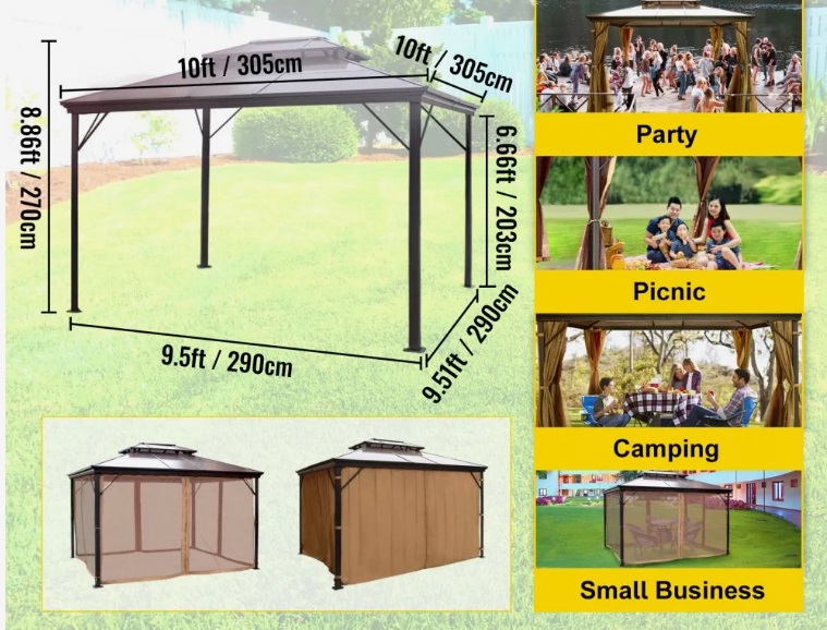 - Široké využitie: Náhrada za altánok 10×10 je ideálna do záhrady, dvora, terasy a iných vonkajších priestorov, vhodná na outdoorové aktivity, ako sú malé podniky, remeselné výstavy, večierky pred zadnou časťou, pikniky, večierky, vonkajšie športové podujatia atď.