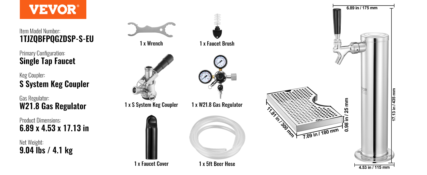 • Dávkovač piva s jedným kohútikom: Dávkovač na pivo VEVOR s jedným kohútikom, vyrobený z vysoko kvalitnej nehrdzavejúcej ocele 304, ponúka výnimočnú odolnosť a spoľahlivosť a je ideálny pre komerčné a rezidenčné dávkovacie systémy. Táto súprava pivnej veže obsahuje 5-metrovú hadicu na pivo, spojku suda S-System, regulátor W21.8 s dvojitým rozchodom, odkvapkávaciu misku na pivo, kohútik, čistiacu kefku, kryt kohútika a sadu montážneho príslušenstva.
