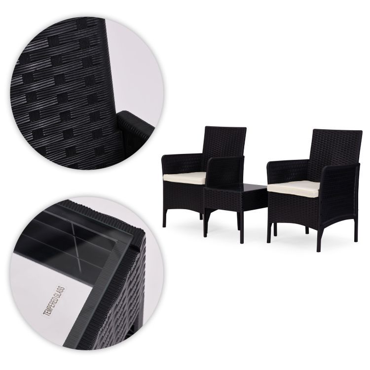 Táto štýlová záhradná súprava nábytku sa skladá z dvoch kresiel a stola . Robustná plastová konštrukcia s povrchom imitujúcim prírodný ratan zaisťuje odolnosť voči poveternostným vplyvom , dlhú životnosť a jednoduché čistenie. Doska stola je vyrobená z 5 mm hrubého tvrdeného skla, ktoré zaisťuje vysokú odolnosť voči poškodeniu. Súprava obsahuje mäkké vankúše vyrobené z vodeodolného polyesteru s gramážou 160 g/m² (hrúbka 4 cm) . Stolička má maximálnu nosnosť 150 kg .
