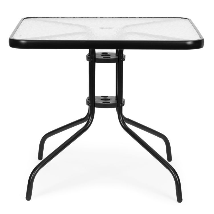 Tento záhradný stôl MultiGarden s rozmermi 80×80 cm je perfektným doplnkom na terasu, do záhrady alebo na balkón. Doska stola je vyrobená z  tvrdeného skla, čo zaručuje odolnosť a jednoduché čistenie . Má tiež  otvor na slnečník s priemerom 4,5 cm, ktorý vám umožní používať ho aj za slnečných dní. Pevná oceľová konštrukcia s práškovou farbou zaisťuje  odolnosť voči poveternostným vplyvom . Nohy stola sú vybavené protišmykovými podnožkami , ktoré zaisťujú bezpečné používanie. Stôl má  štyri osoby .